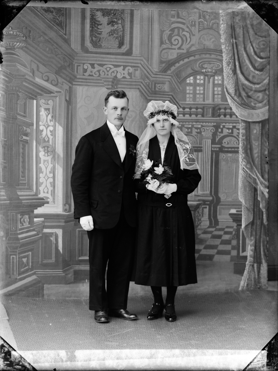 Ateljéporträtt - Brudpar från Lysta, Harg socken, Uppland 1927