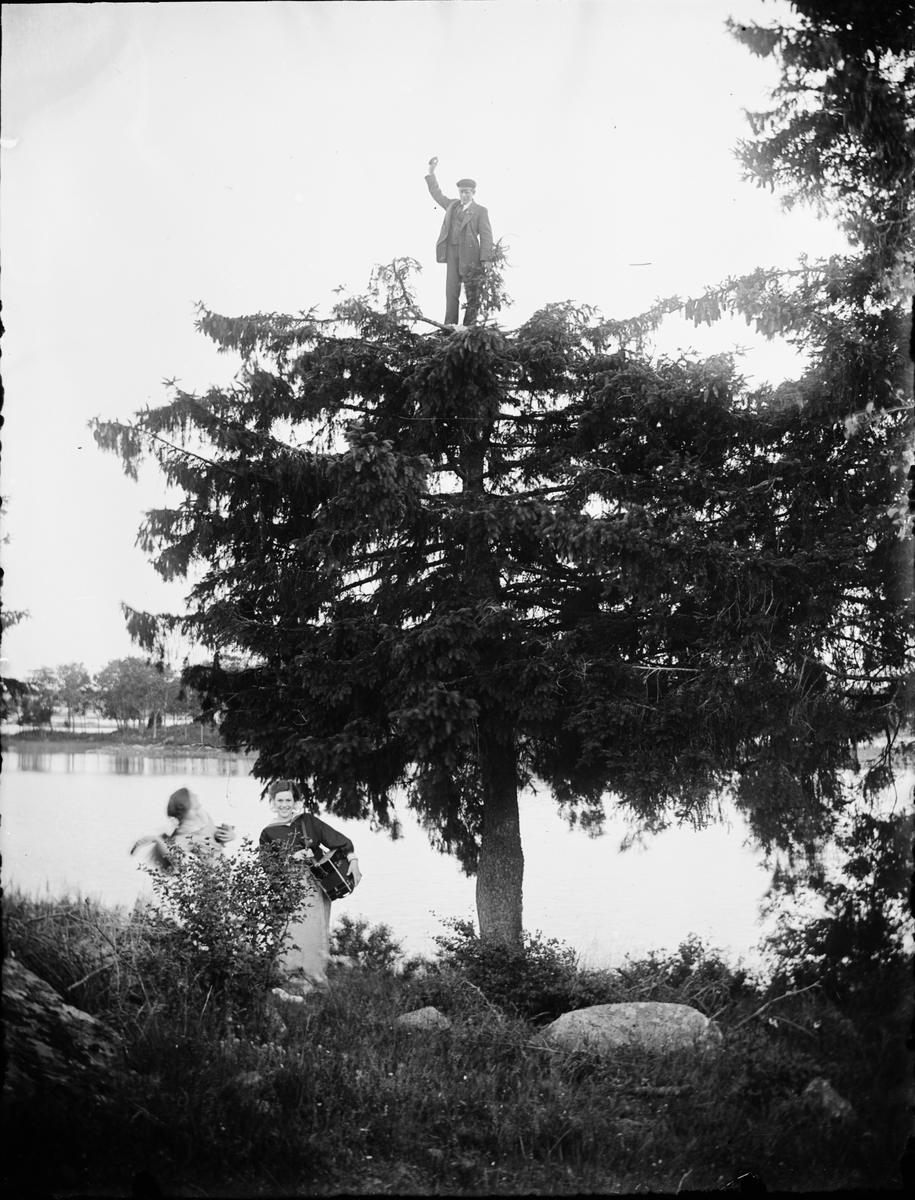 Algot Lindqvist står högst upp i en gran, Östhammar, Uppland