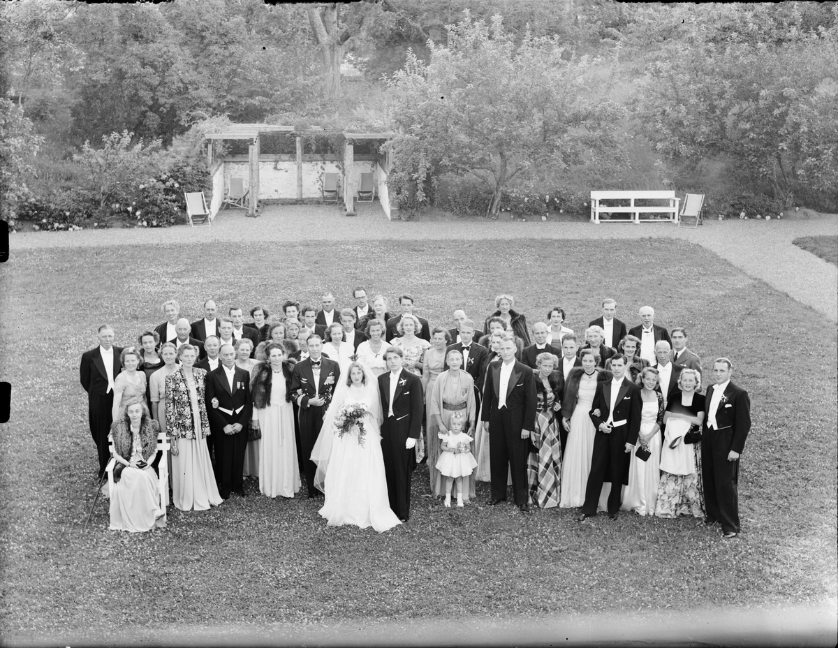 Titel: Brudpar med bröllopsgäster, Gimo herrgård, Uppland