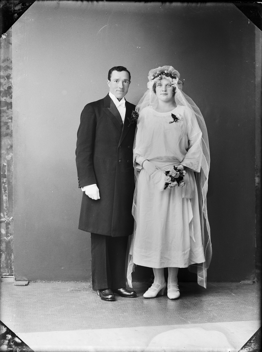 Ateljéporträtt - brudparet Johansson från Fors, Hökhuvud socken, Uppland 1924