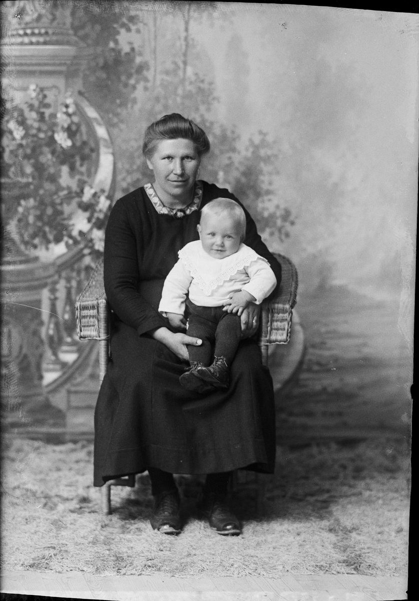 Ateljéporträtt - fru och barn till skogvaktare W Karlsson från Sanda, Harg socken, Östhammar, Uppland 1923