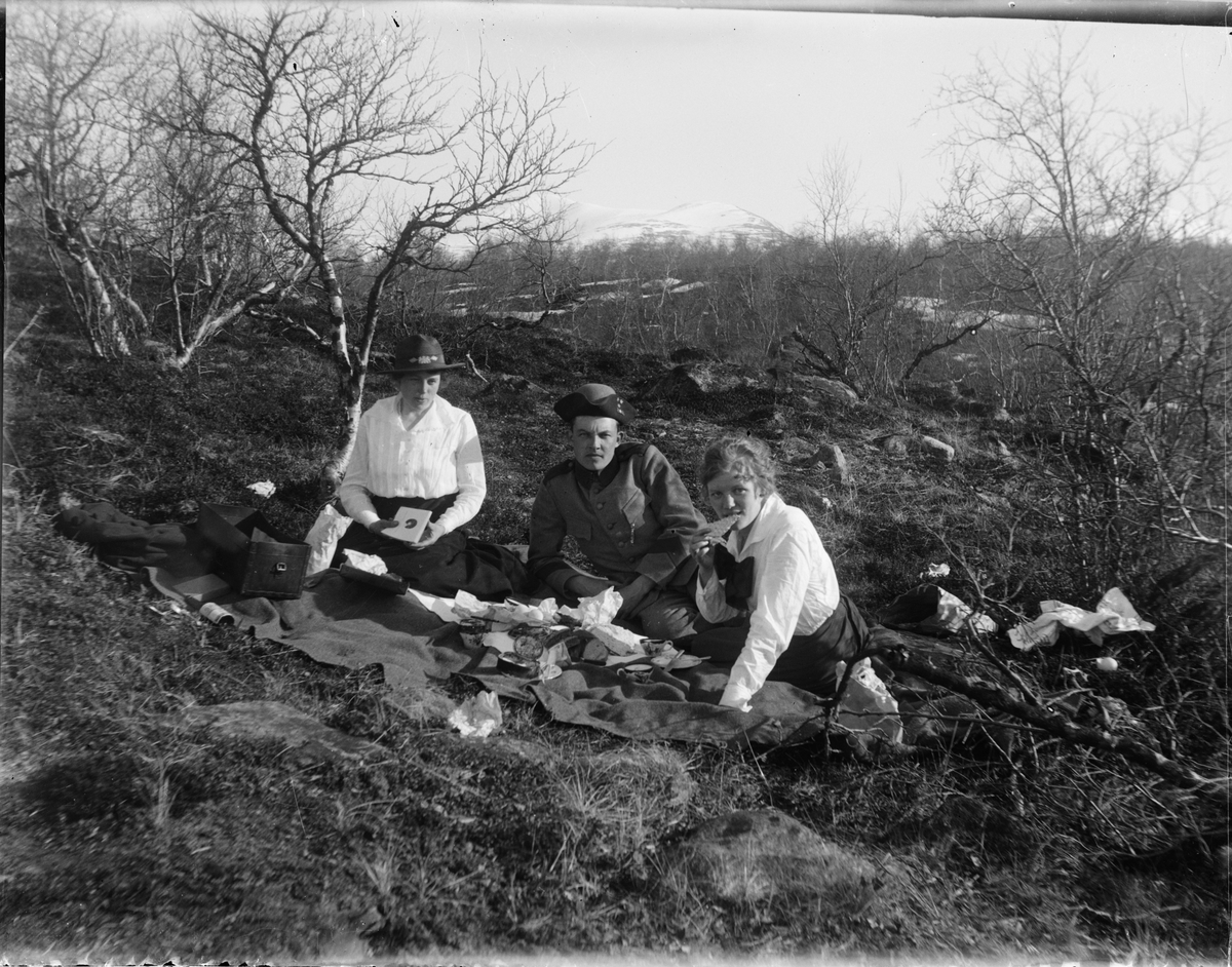 Man i uniform har picknick tillsammans med två kvinnor i fjällandskap, Boden