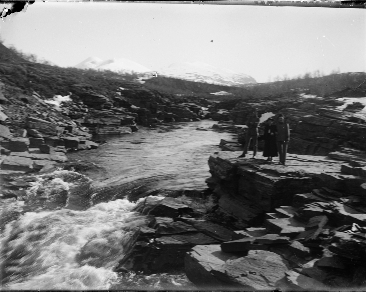 Män och kvinnor vid vattendrag i fjällandskap, Boden