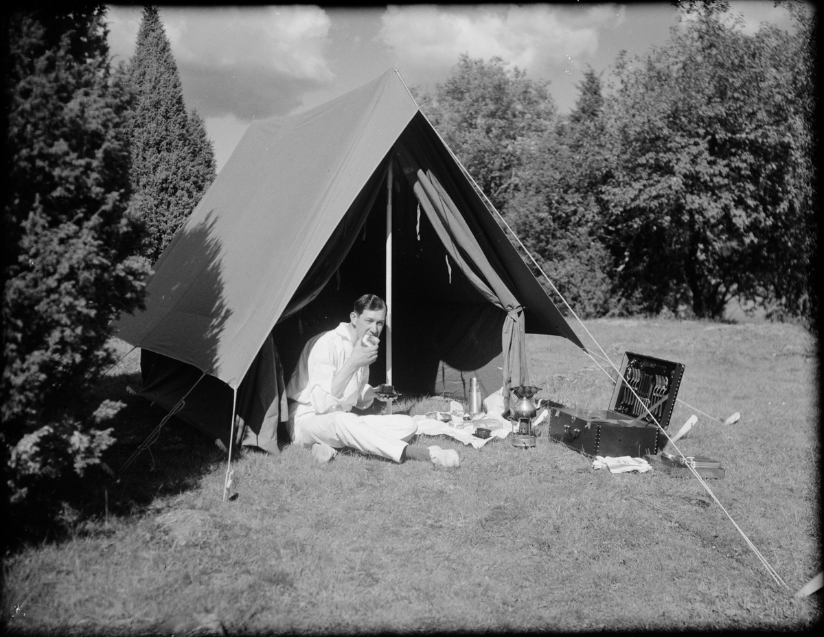 Josef Edhlund sitter och äter utanför tältet, Sverige
