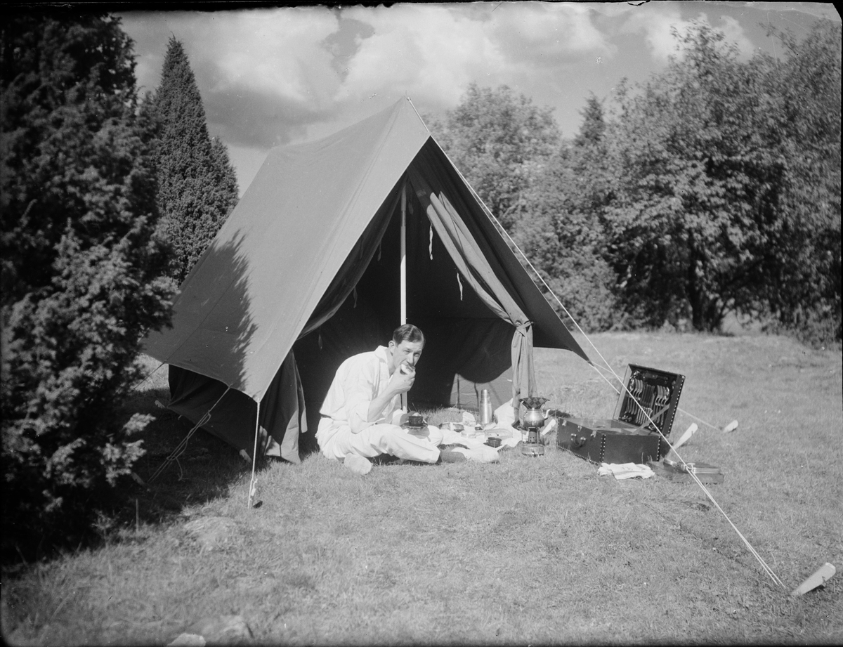 Josef Edhlund sitter och äter utanför tältet, Sverige