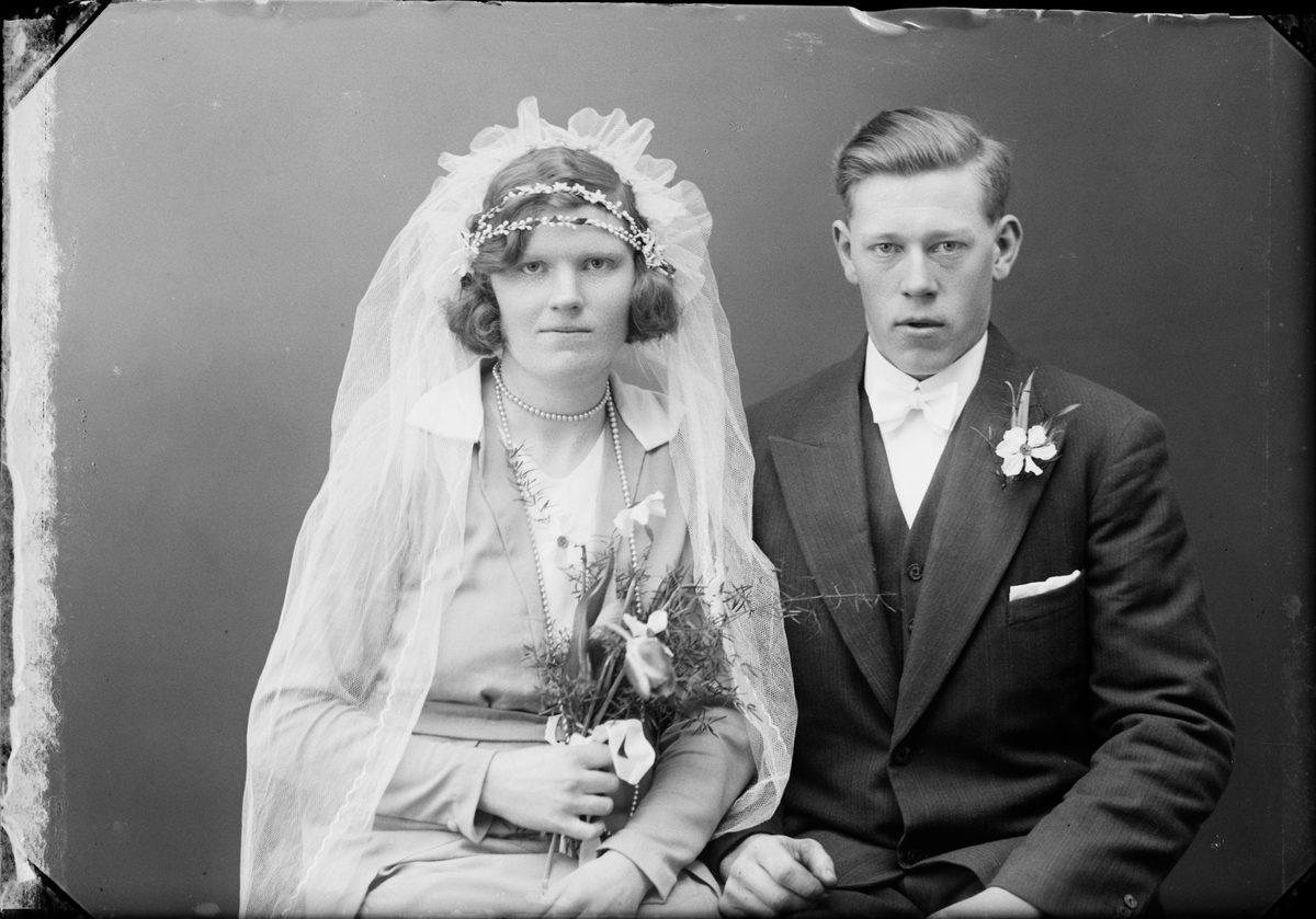 Ateljéporträtt - brudparet Jansson från Aspö, Börstil socken, Uppland
