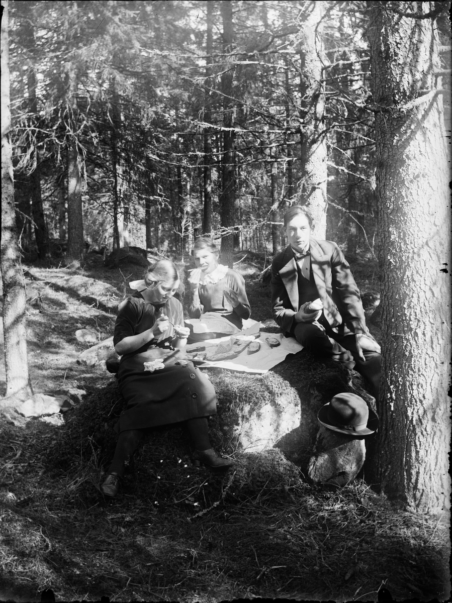 Sara, Irma och Josef på picknick i skogen, Östhammar, Uppland