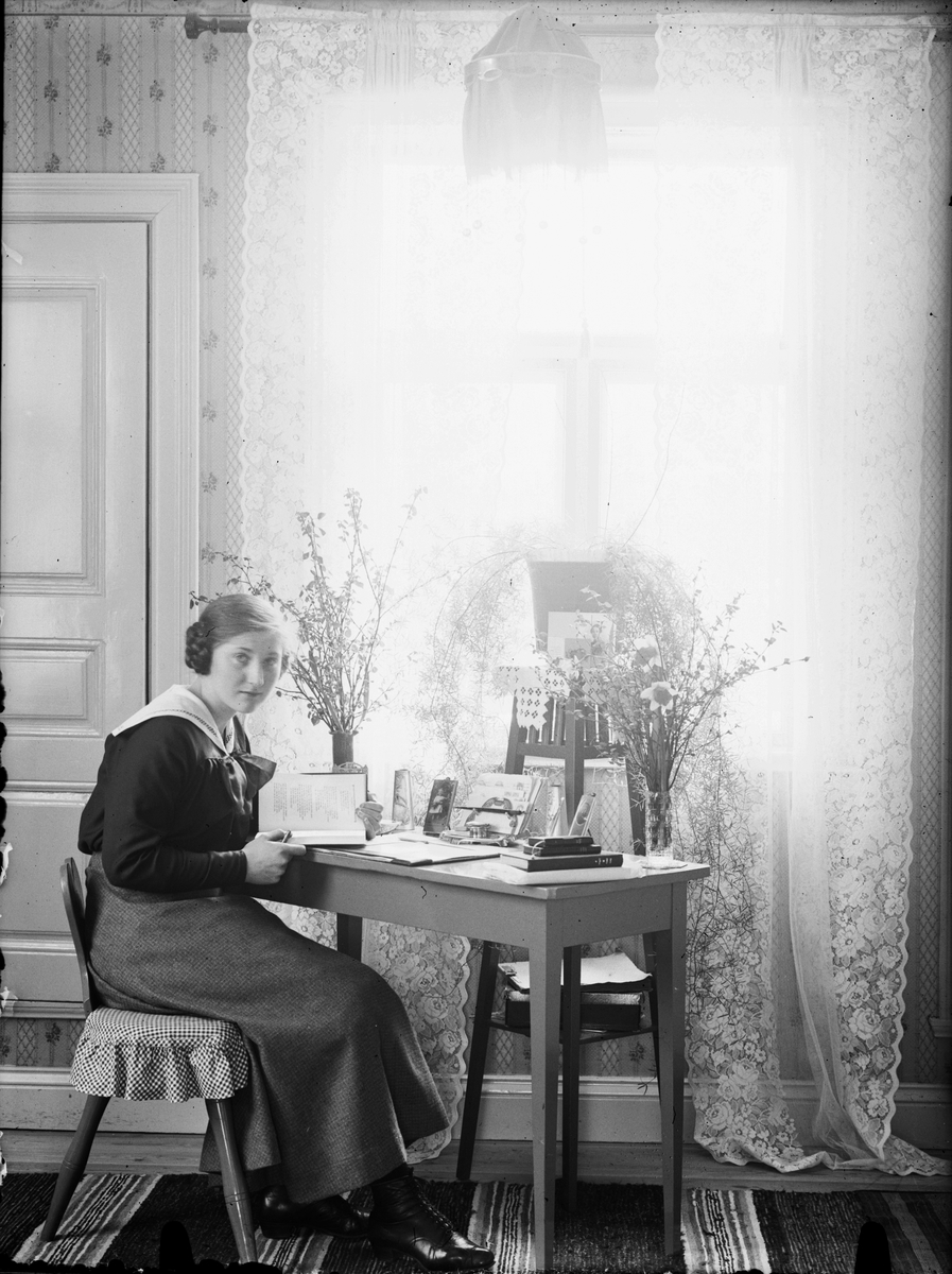 Sara Edhlund vid skrivbordet, Östhammar, Uppland