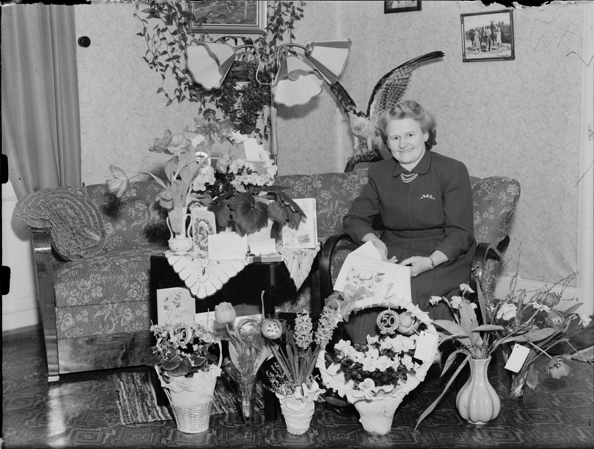 Kvinna i bostadsmiljö omgiven av blommor, Östhammar, Uppland,