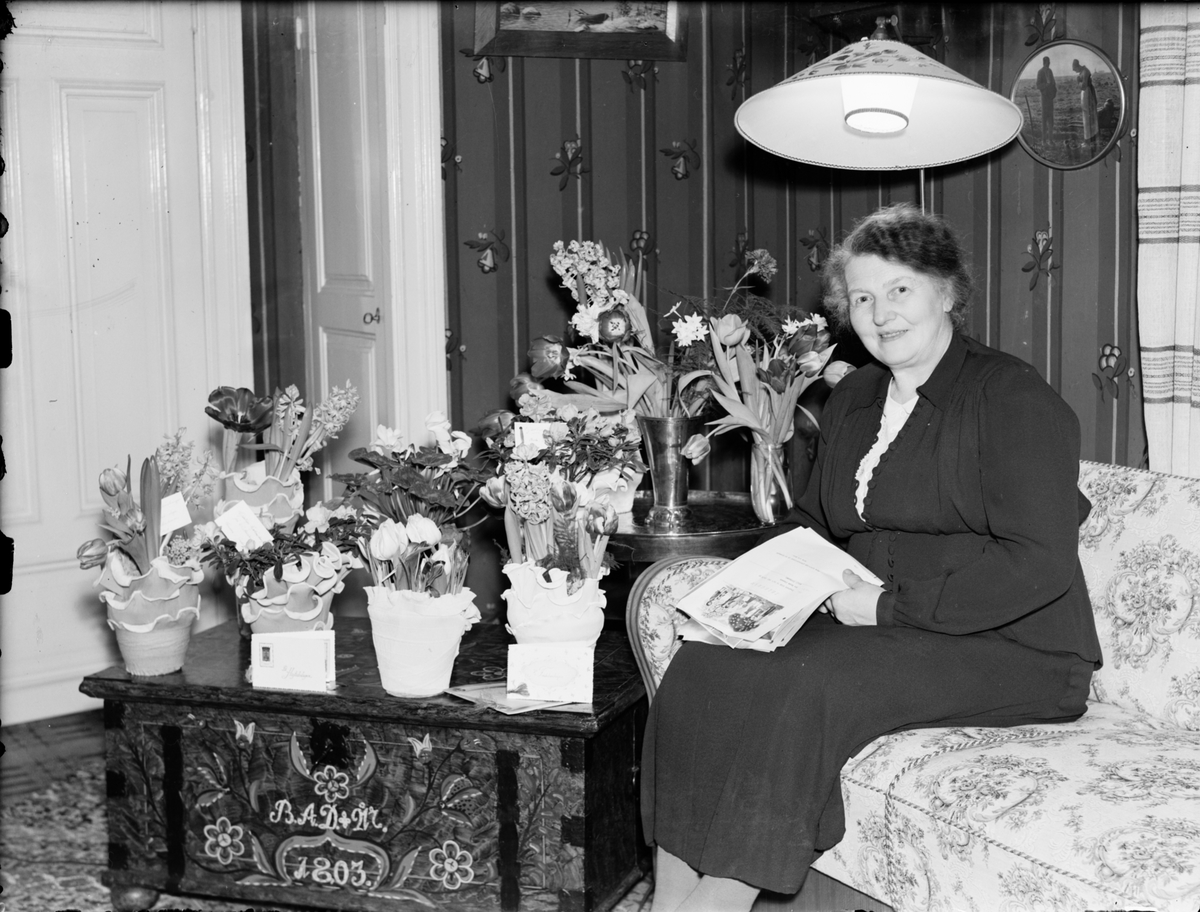 Kvinna i bostadsmiljö omgiven av blommor, Östhammar, Uppland,