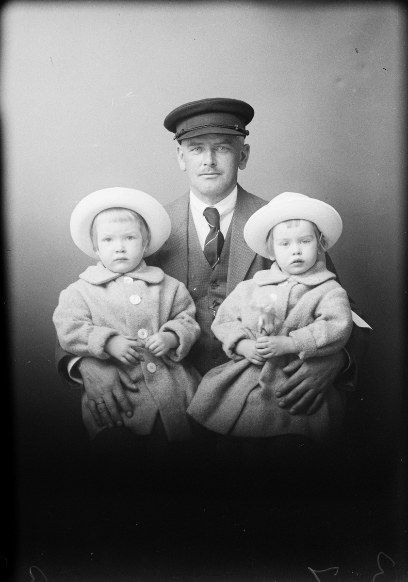 Ateljéporträtt - man med två flickor klädda i kappa och hatt, Östhammar, Uppland