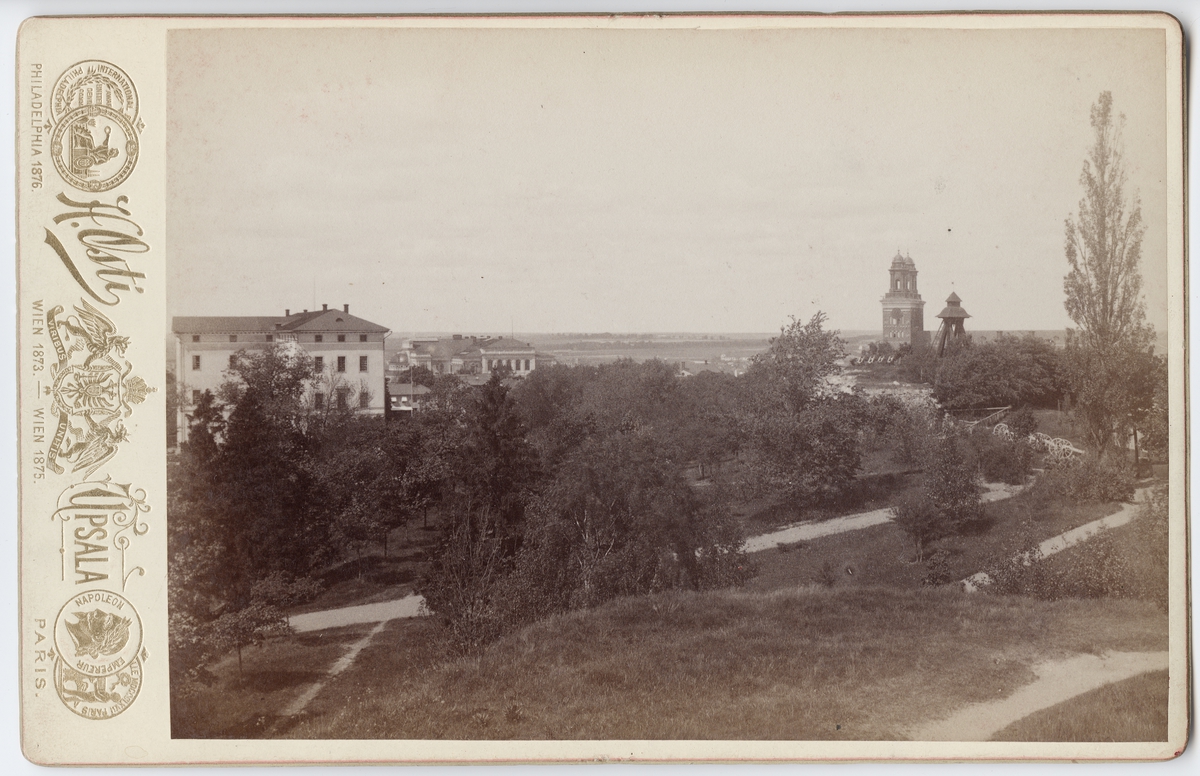 Vy från Gräsgårdsbastionen vid Uppsala slott mot Styrbiskop med Gunillaklockan samt Carolina Rediviva, Universitetshuset och Uppsala domkyrka 1886