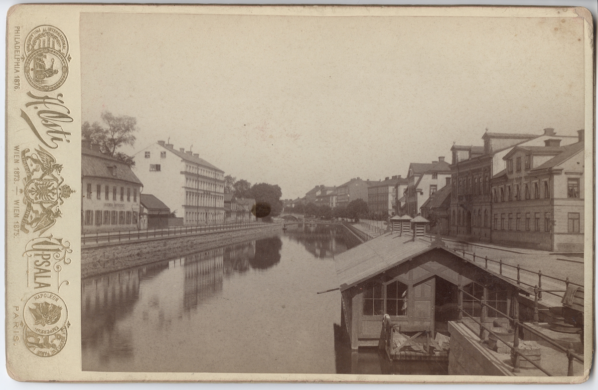 Västra Ågatan, Fyrisån och Östra Ågatan från Islandsbron, Uppsala 1886
