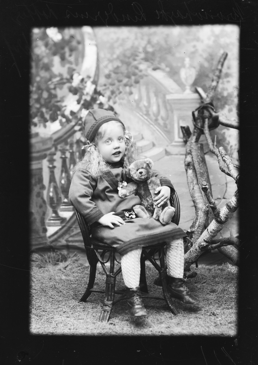 Ateljéporträtt - Lindgrens flicka klädd i folkdräkt sitter i en korgstol med nallen i knät, Östhammar, Uppland