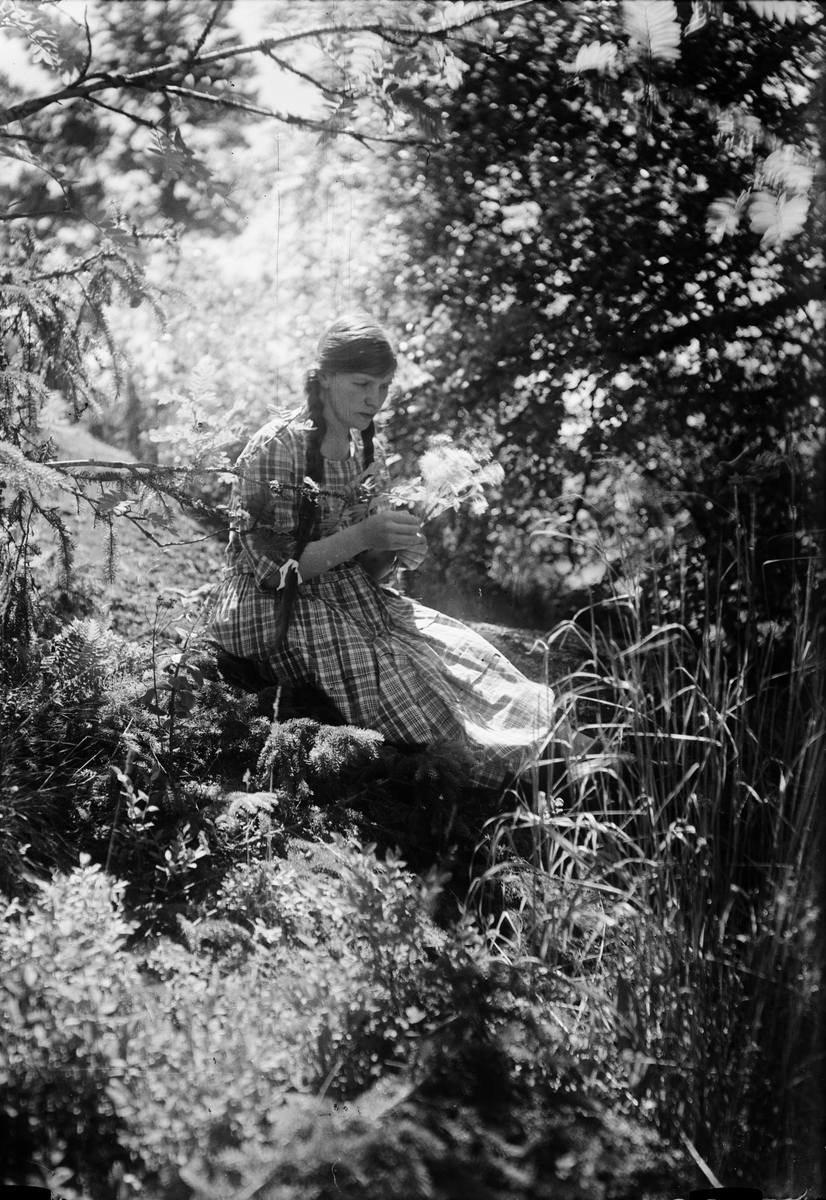 Kvinna sittande i skogsmark, Östhammar, Uppland