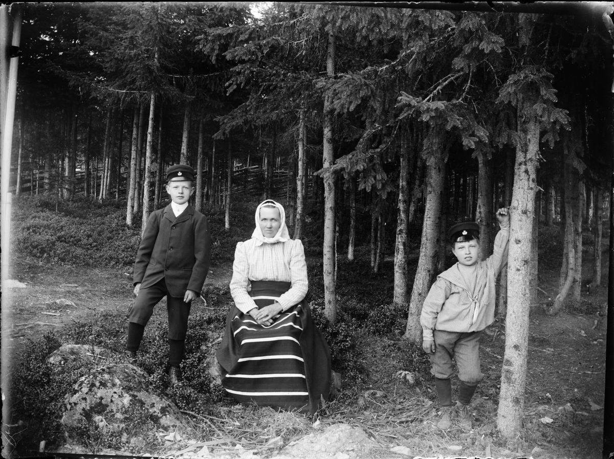 Kvinna i folkdräkt och två pojkar i skogsmark, Dalarna