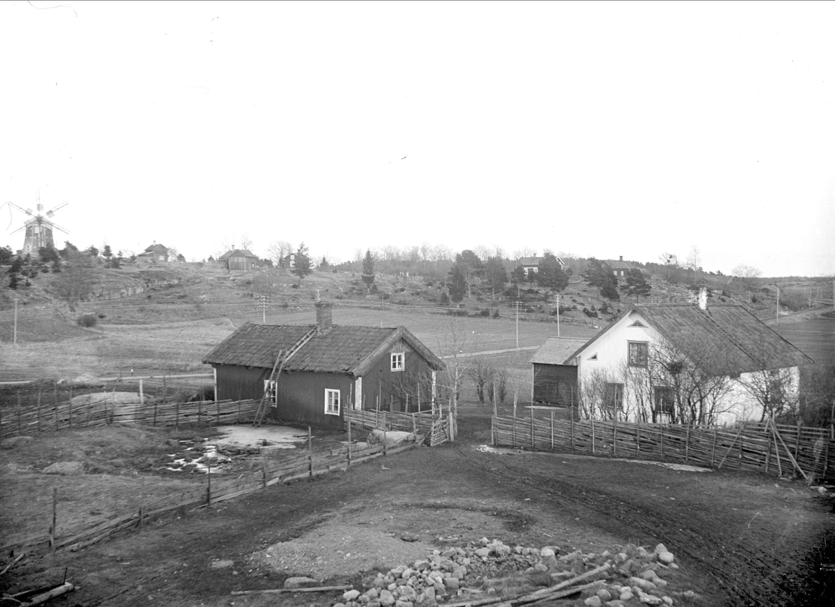 Bymiljö med väderkvarn och gärdesgårdar, Backa, Villberga socken, Uppland