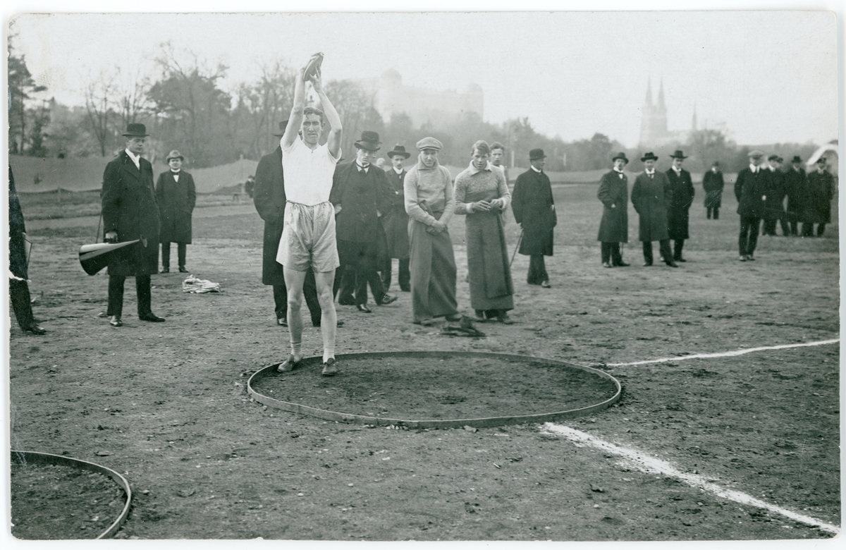 Vykort - Inge Lindholm kastar diskus vid femkampstävling på Studenternas Idrottsplats, åskådare är bland andra konkurrenterna Nils Jansson och Einar Albinsson, Uppsala 1910-1920-tal
