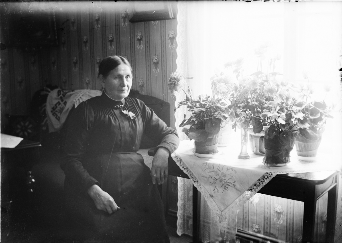 Kvinna sittande vid bord med krukväxter, Östhammar, Uppland