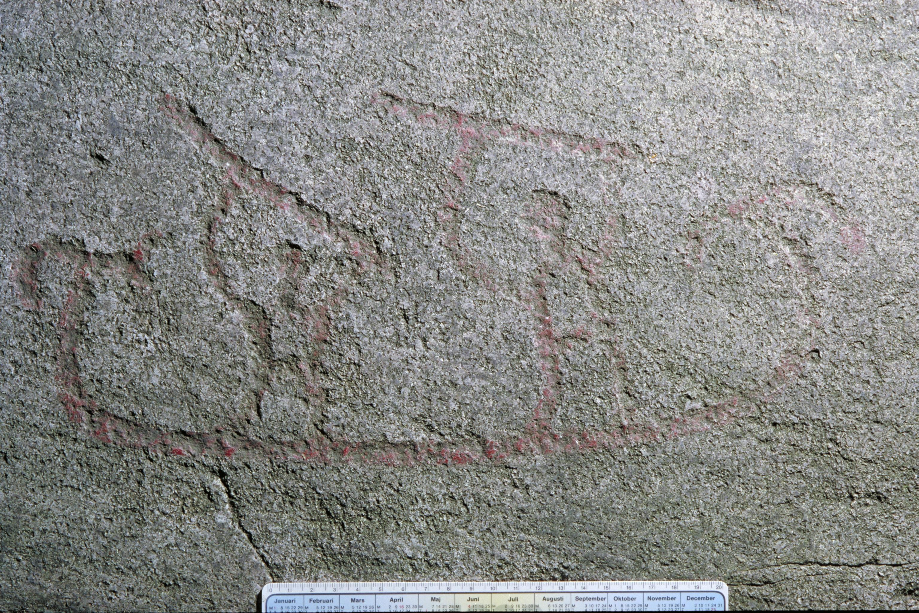 Skepp och människofigurer med höjda spjut. Tossene 73:1.