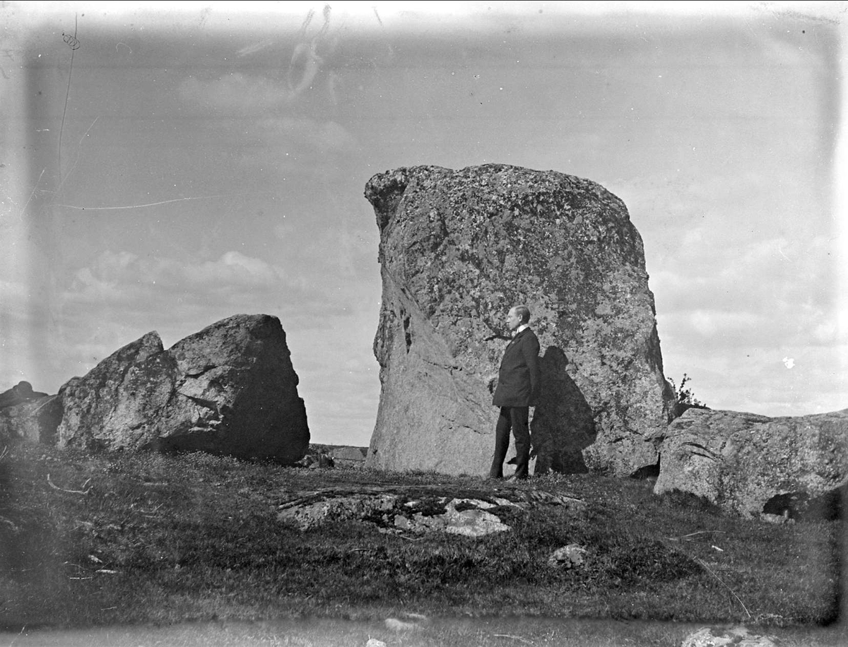 Man vid flyttblock i Säva, Balingsta socken, Uppland, maj 1912