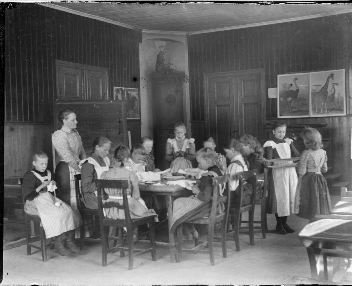 Syslöjd med lärarinnan Eva Nilsson, eventuellt i Funbo kyrkskola, Funbo socken, Uppland.