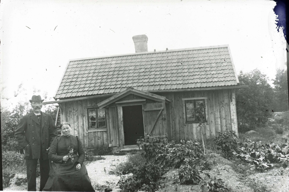 Äldre kvinna och man vid torp, Björklinge eller Funbo socken, Uppland