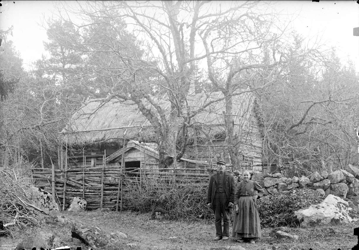 Titel: Lotta och August Bjuv framför soldattorpet i Åkerby, Funbo socken, Uppland