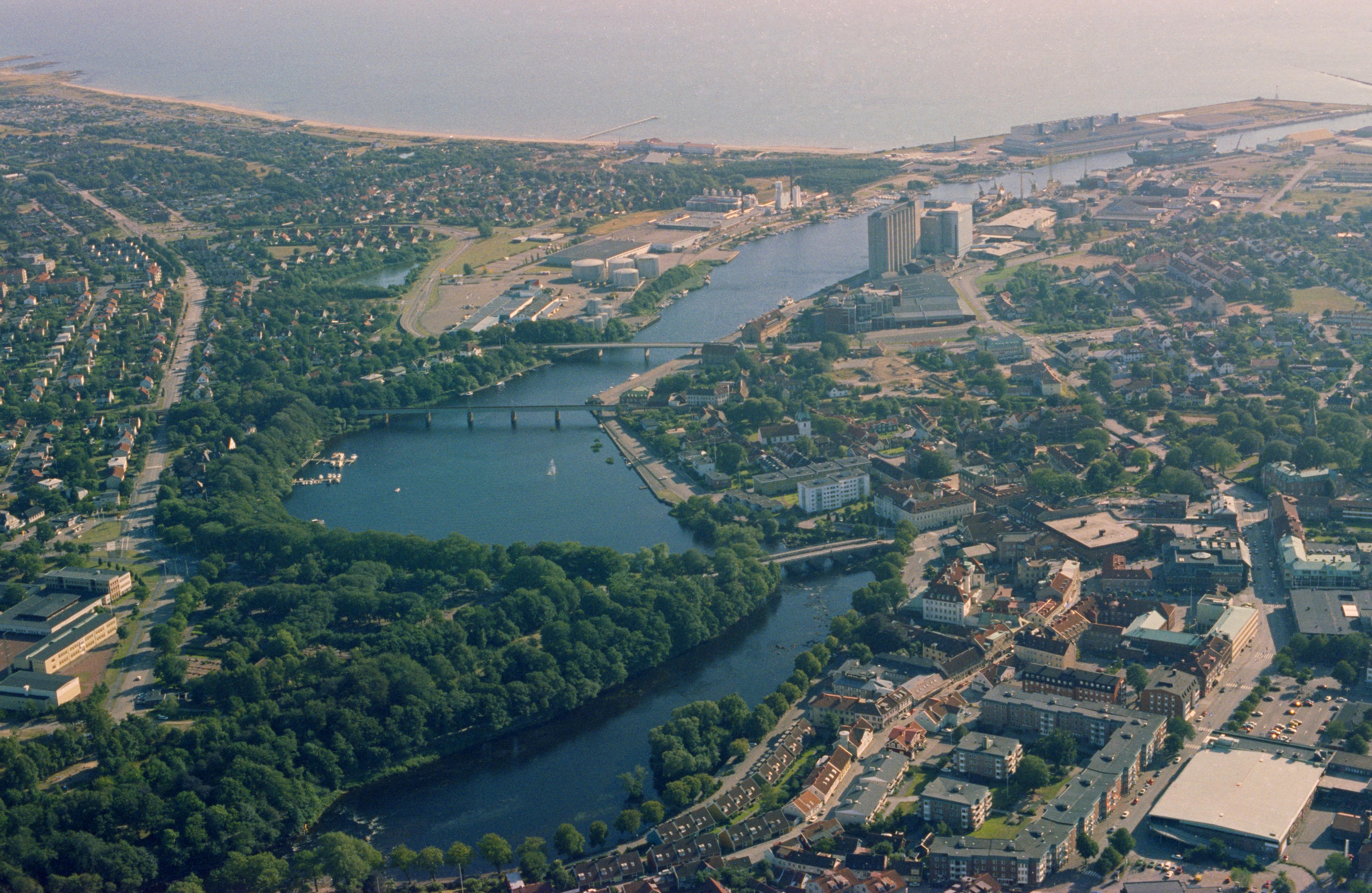 Ån Ätran och Falkenbergs stad. Bilden är tagen mot (väderstreck): SO