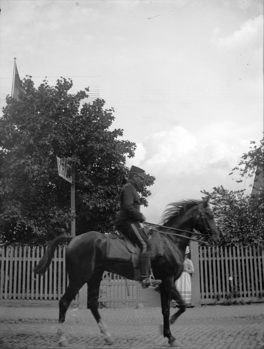 Andra Svea Artilleriregemente passerar Svartbäcksgatan 37, kvarteret Edda, Uppsala 1900 - 1901