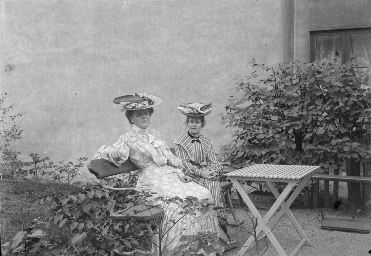 Titel: Emma Osti och kvinna i trädgården, Bredgränd 11, Uppsala efter 1893