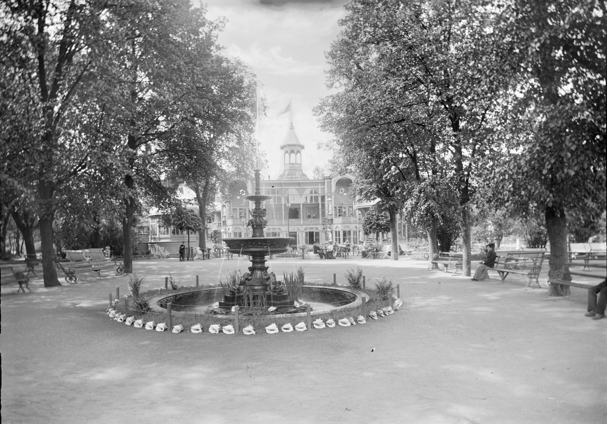 Fontän i Stadsträdgården utanför restaurang Flustret, Uppsala 1906