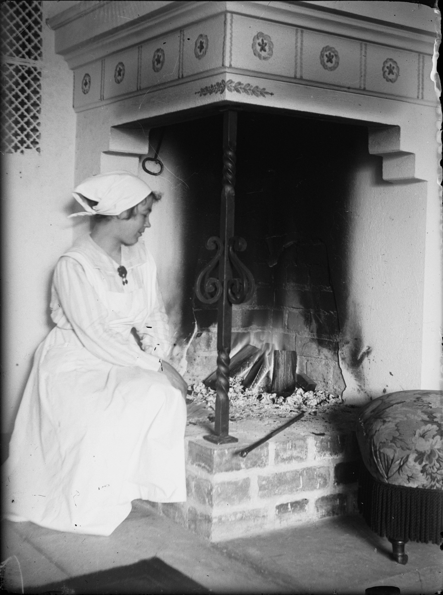 Kvinna sitter vid öppen spis, Östhammar, Uppland