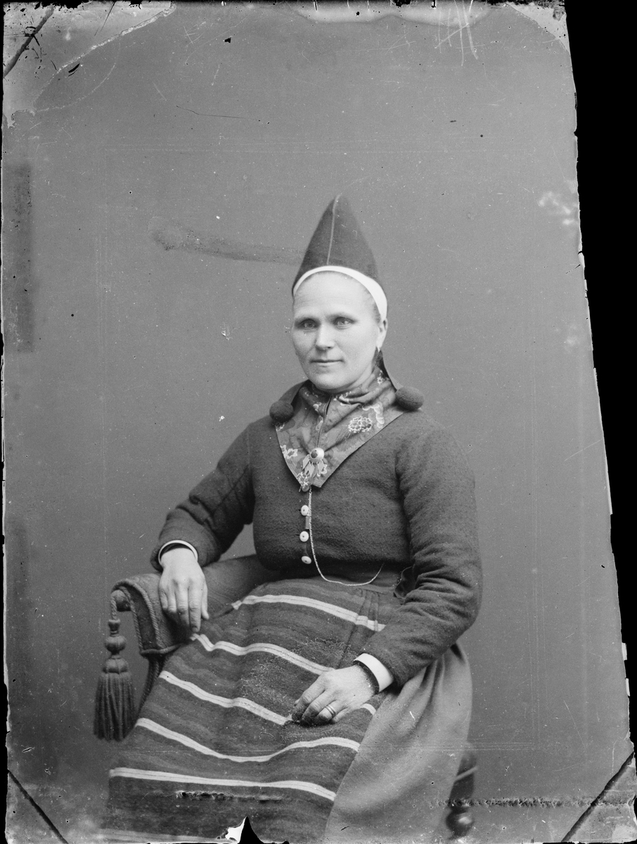 Titel: Ateljéporträtt - kvinna klädd i folkdräkt från Dalarna