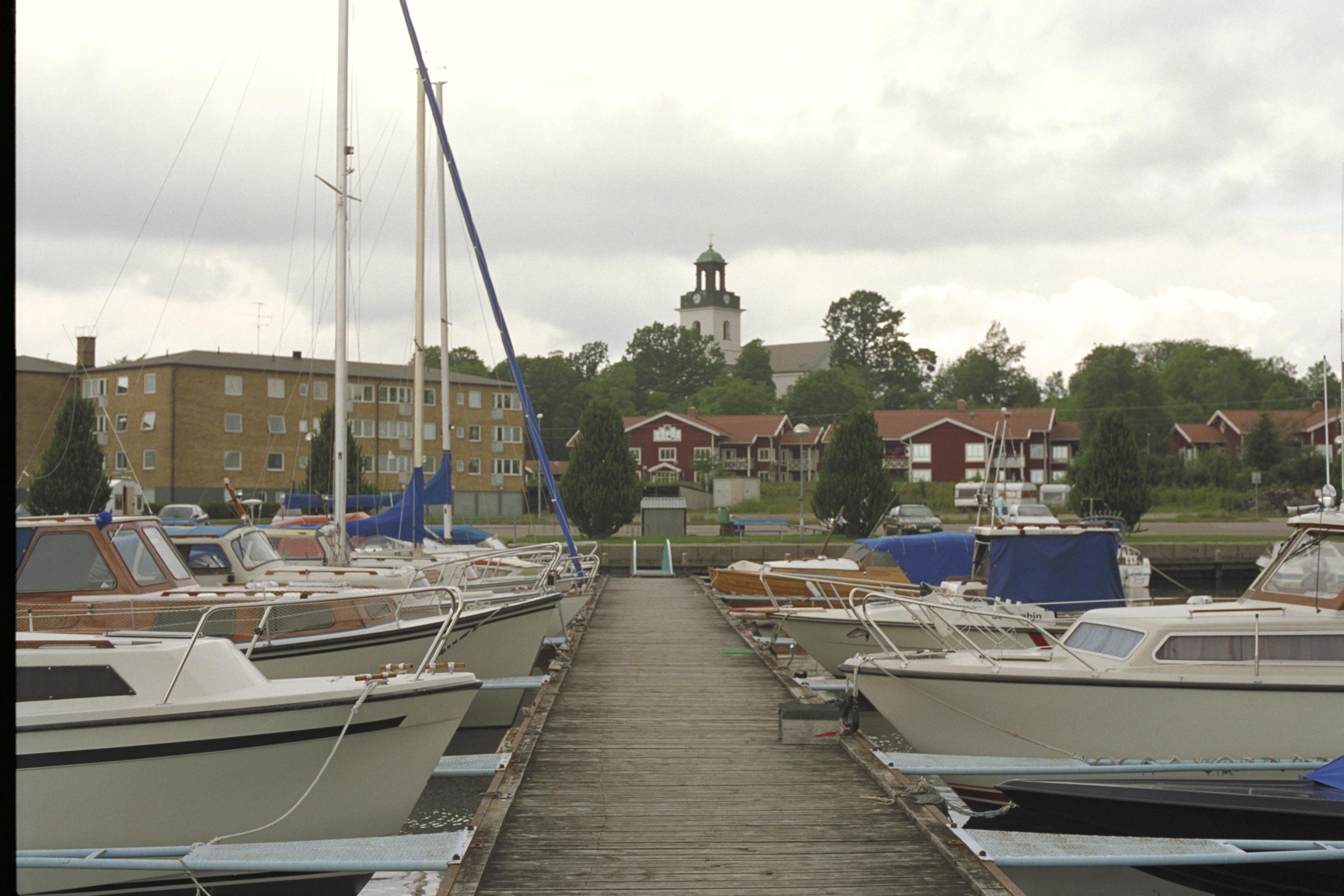Småbåtshamnen med Åmåls kyrka i fonden.