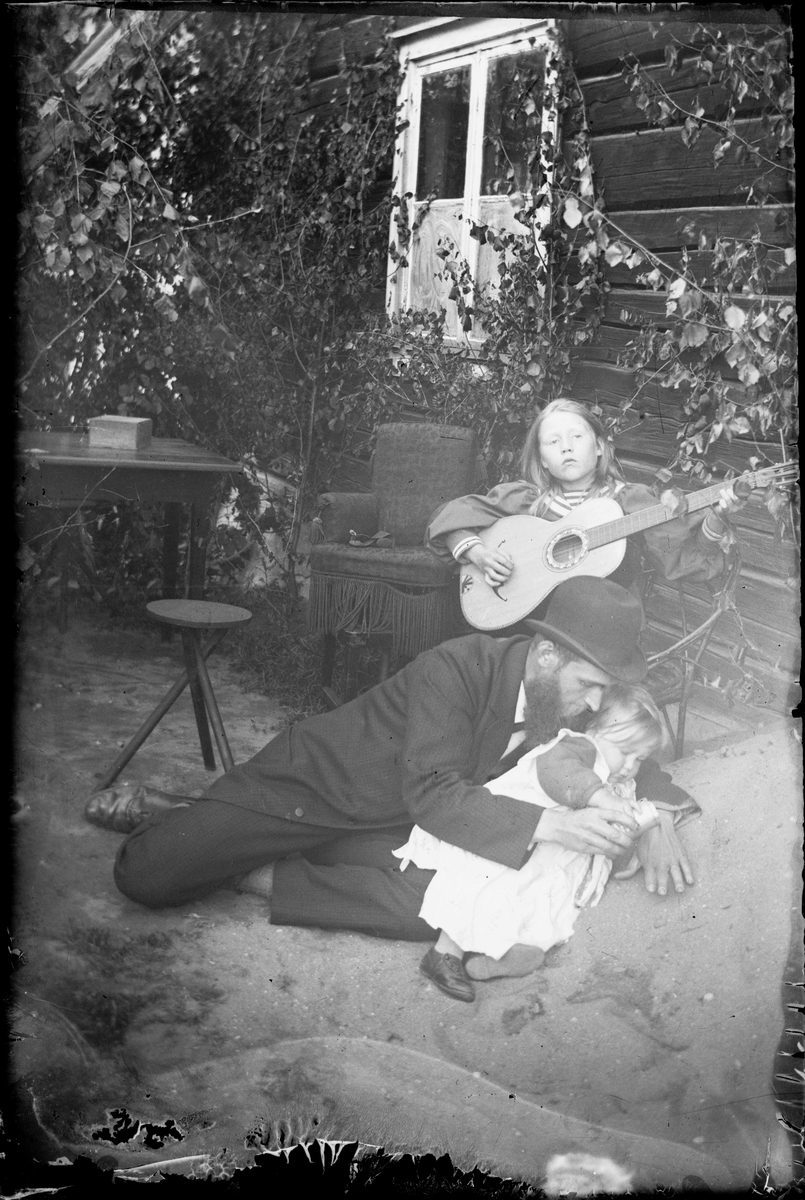 Ruth Skötsner spelar gitarr, Per Elis och Josef Edhlund leker i sandhögen, Östhammar, Uppland
