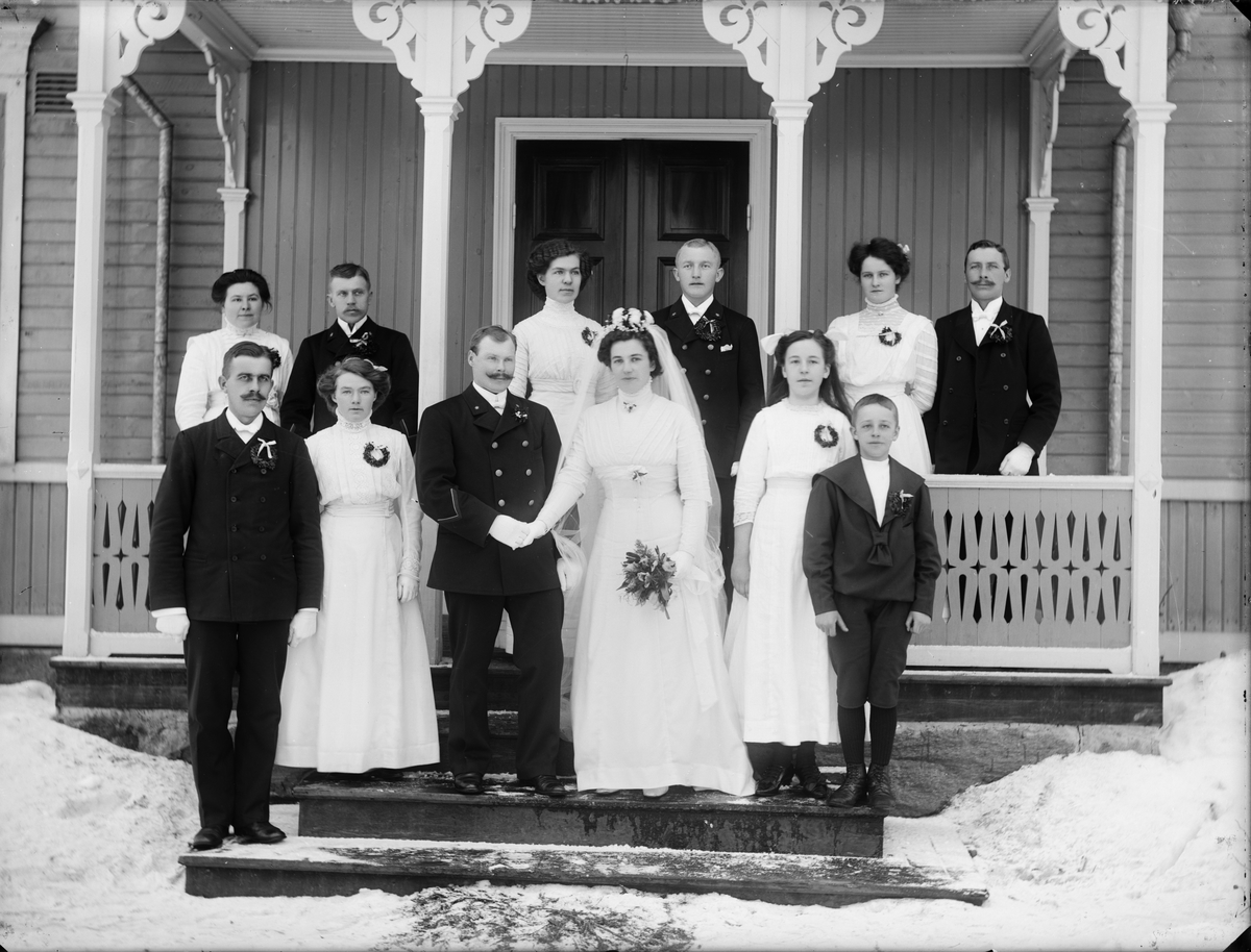 Brudpar med brudnäbbar, tärnor och marskalkar, Östhammar, Uppland