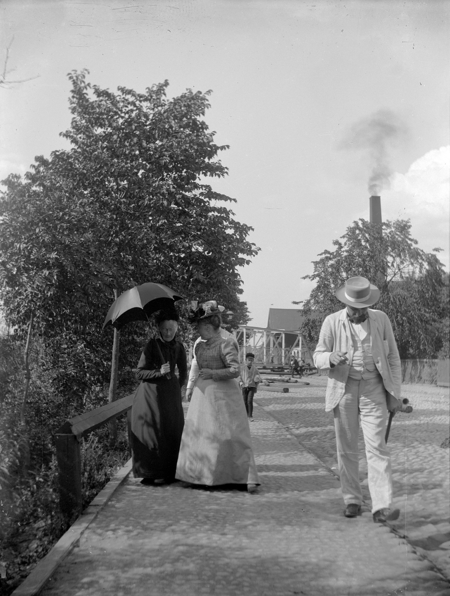 Josefina Liljefors, Lina Widerbäck och Artur Rydin på Svartbäcksgatan med broflyttningen i bakgrunden, Uppsala 1901