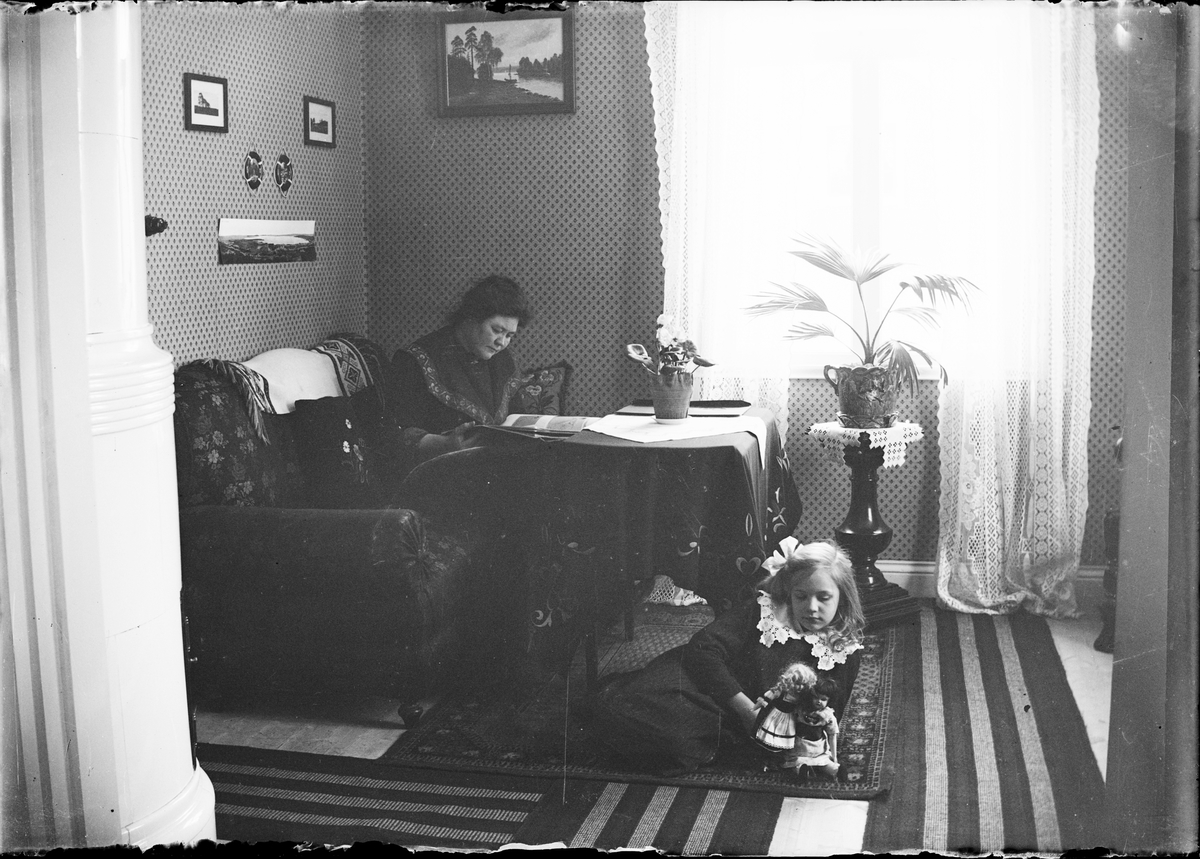 Brita läser och Tyra leker med dockor i hemmet, Östhammar, Uppland