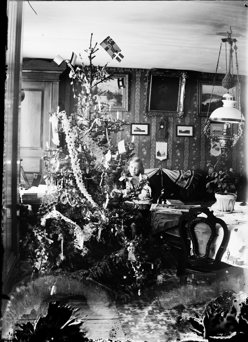 Tyra Edhlund sitter i soffan och tittar fram bakom julgranen, Guldskäret, Östhammar, Uppland