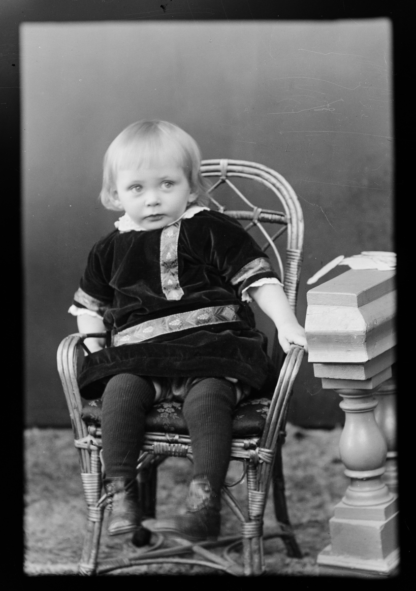 Ateljéporträtt - ett barn sitter i en korgstol, Östhammar, Uppland