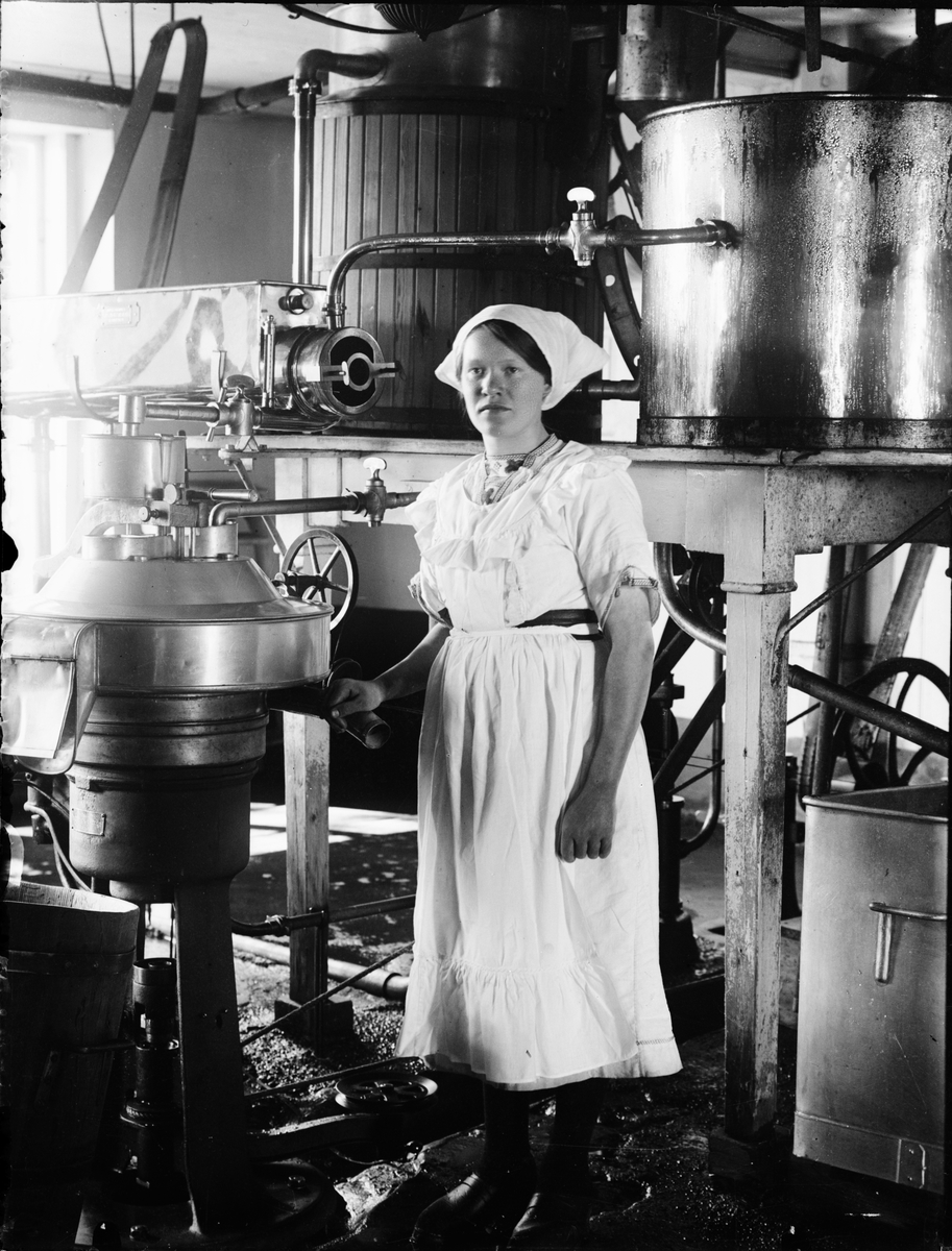 Kvinna i ett mejeri, Östhammar, Uppland omkring 1915