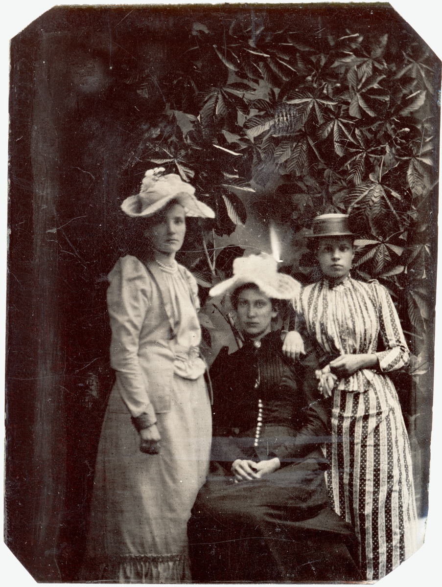 Ferrotyp - tre unga kvinnor, Elisabeth (Elise) Wenster i mitten, Uppsala, 15 juli 1891