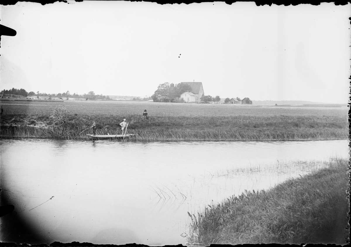 Roddbåt på Olandsån med Skäfthammars kyrka i bakgrunden. Närmast i bild Hökhuvuds socken, Uppland