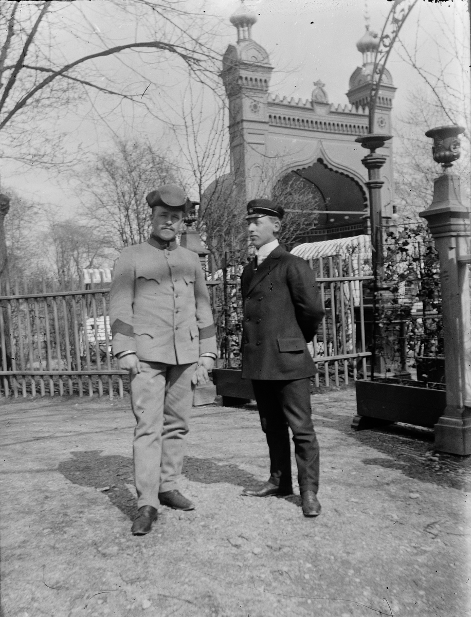 Män i uniform utanför Restaurang Rullan, Kungsgatan 44, kvarteret Frigg, stadsdelen Dragarbrunn, Uppsala