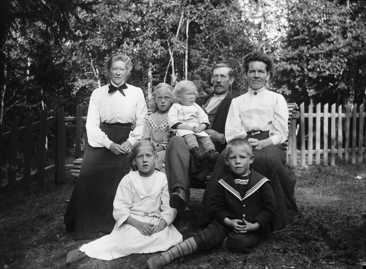 Man, kvinnor och barn i trädgården