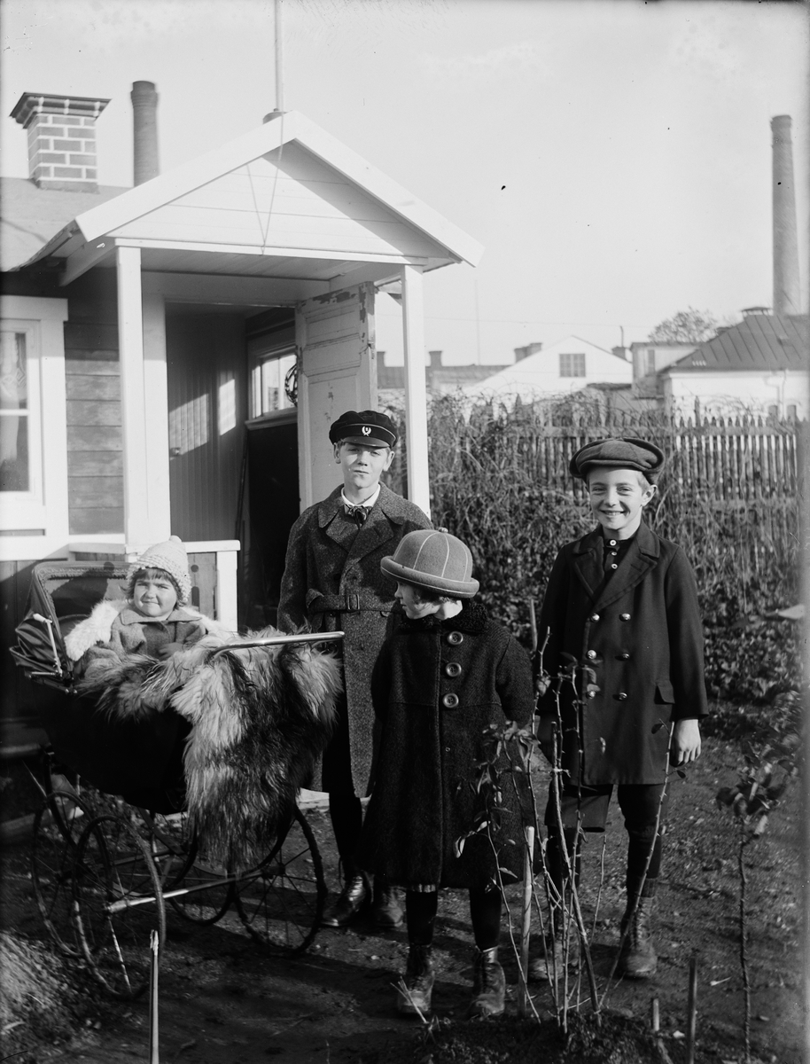 Kalle, Rolf, Inga-Britt och Ella Ärnström vid familjens kolonistuga, nuvarande kvarteret Luthagsstranden, Luthagen, Uppsala, sannolikt 1924