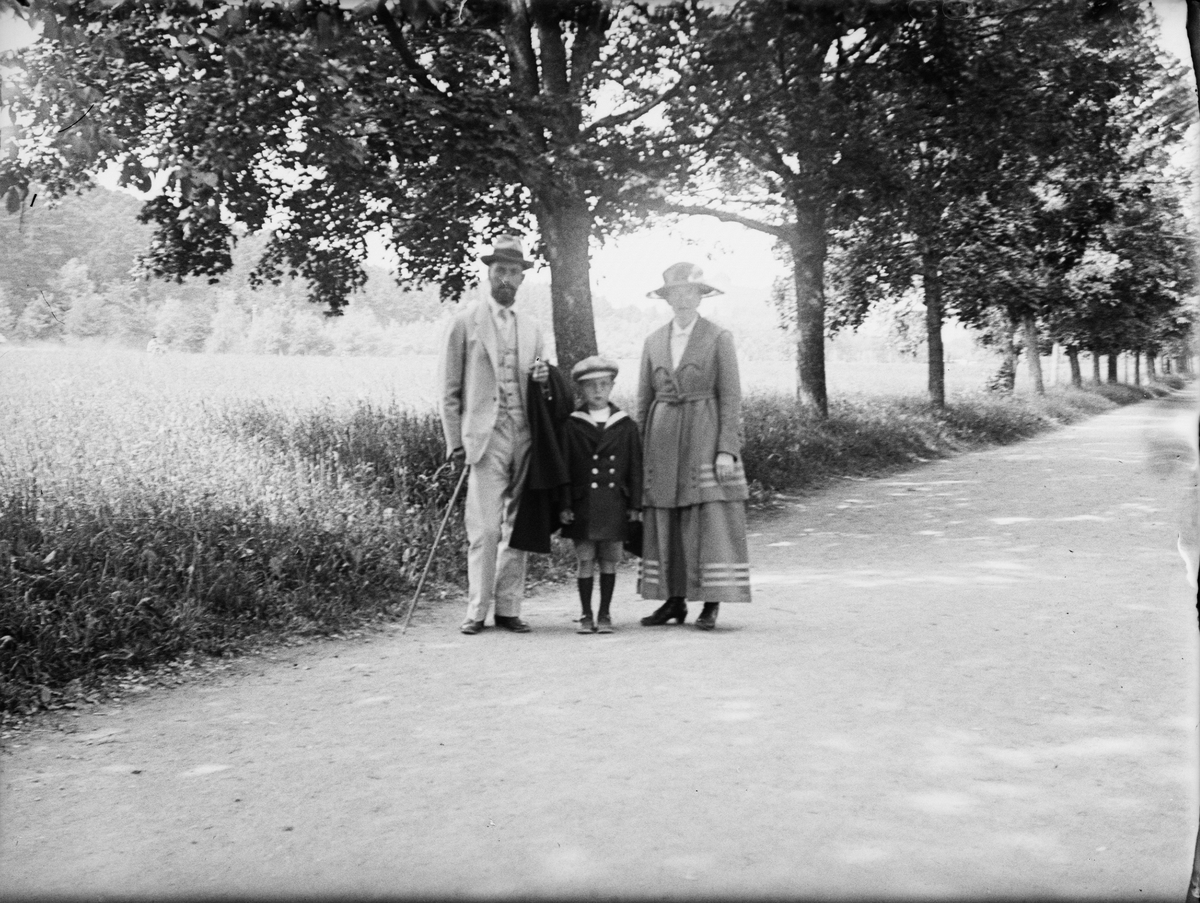 Man, kvinna och pojke vid vägkant