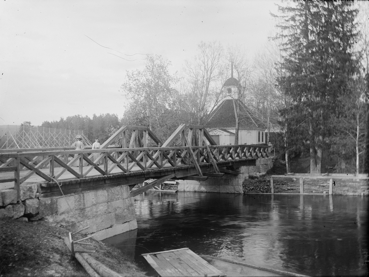 Bro över Ljustorpsån, Hässjö socken, Medelpad. I bakgrunden Lögdö kyrka