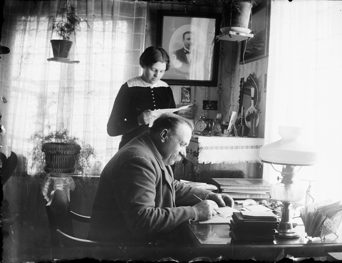 A G Borg sitter vid skrivbordet och "Tilan" Borg står bredvid med ett papper i handen, Sanda, Harg socken, Uppland